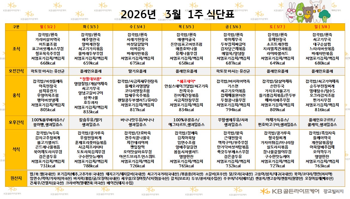 광교빌리지 [식단안내] 2026년 3월 1주 식단표 페이지 정보 작성자 최고관리자 댓글 0건 조회 4회 작성일 26-02-27 17:23 목록 본문 목록 이전글[식단안내] 2026년 3월 1주 식단표 26.02.27 다음글[하루의 식단] 2026년 2월 25일 26.02.27