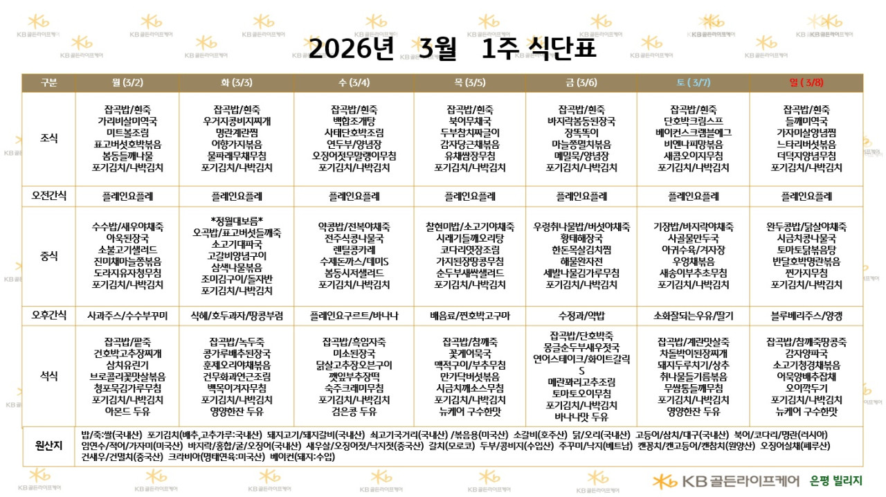 은평빌리지 [식단안내] 2026년 3월 1주차 식단표 페이지 정보 작성자 최고관리자 댓글 0건 조회 6회 작성일 26-02-28 10:43 목록 본문 목록 이전글[오늘의식단] 2026년 2월 23일 중식 26.02.28 다음글[하루의식단] 2026년 2월 26일 목요일 조/중/석식 26.02.28