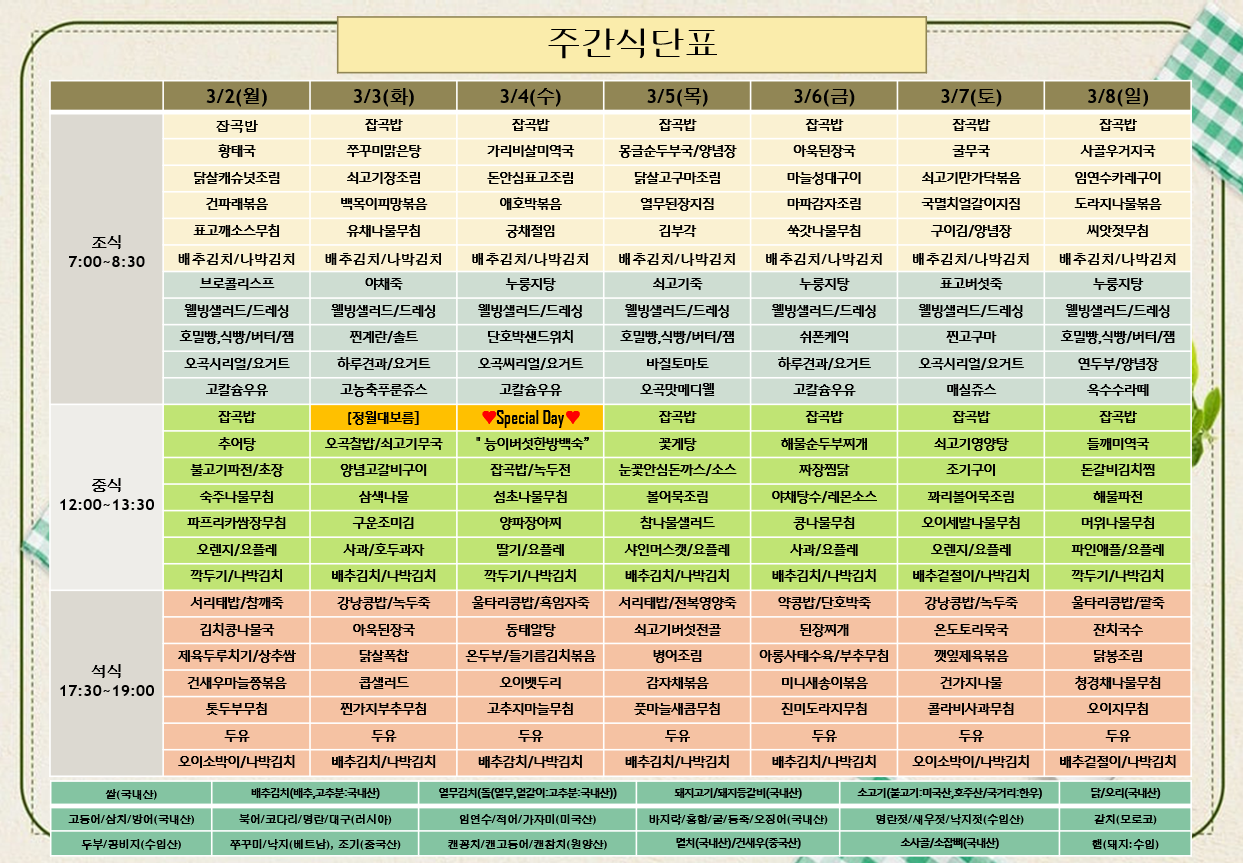 평창카운티 [식단안내] 2026년 3월 1주차 식단표 페이지 정보 작성자 최고관리자 댓글 0건 조회 4회 작성일 26-02-28 11:54 목록 본문 목록 다음글[하루의 식단] 2026년 2월 25일 (조/중/석) 26.02.28