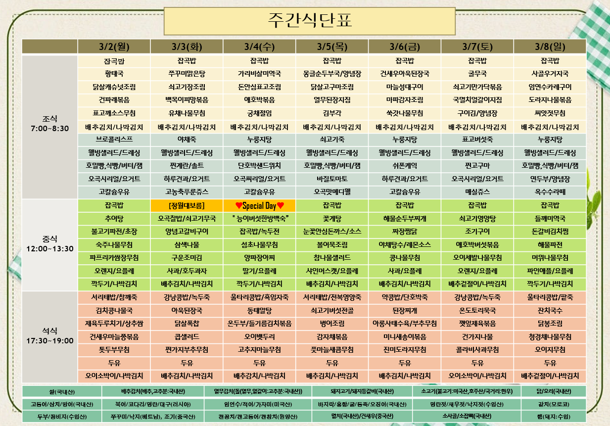 평창카운티 [식단안내] 2026년 3월 1주차 식단표 페이지 정보 작성자 최고관리자 댓글 0건 조회 55회 작성일 26-02-28 11:54 목록 본문 목록 이전글[식단안내] 2026년 3월 1주차 식단표 26.03.03 다음글[하루의 식단] 2026년 2월 25일 (조/중/석) 26.02.28