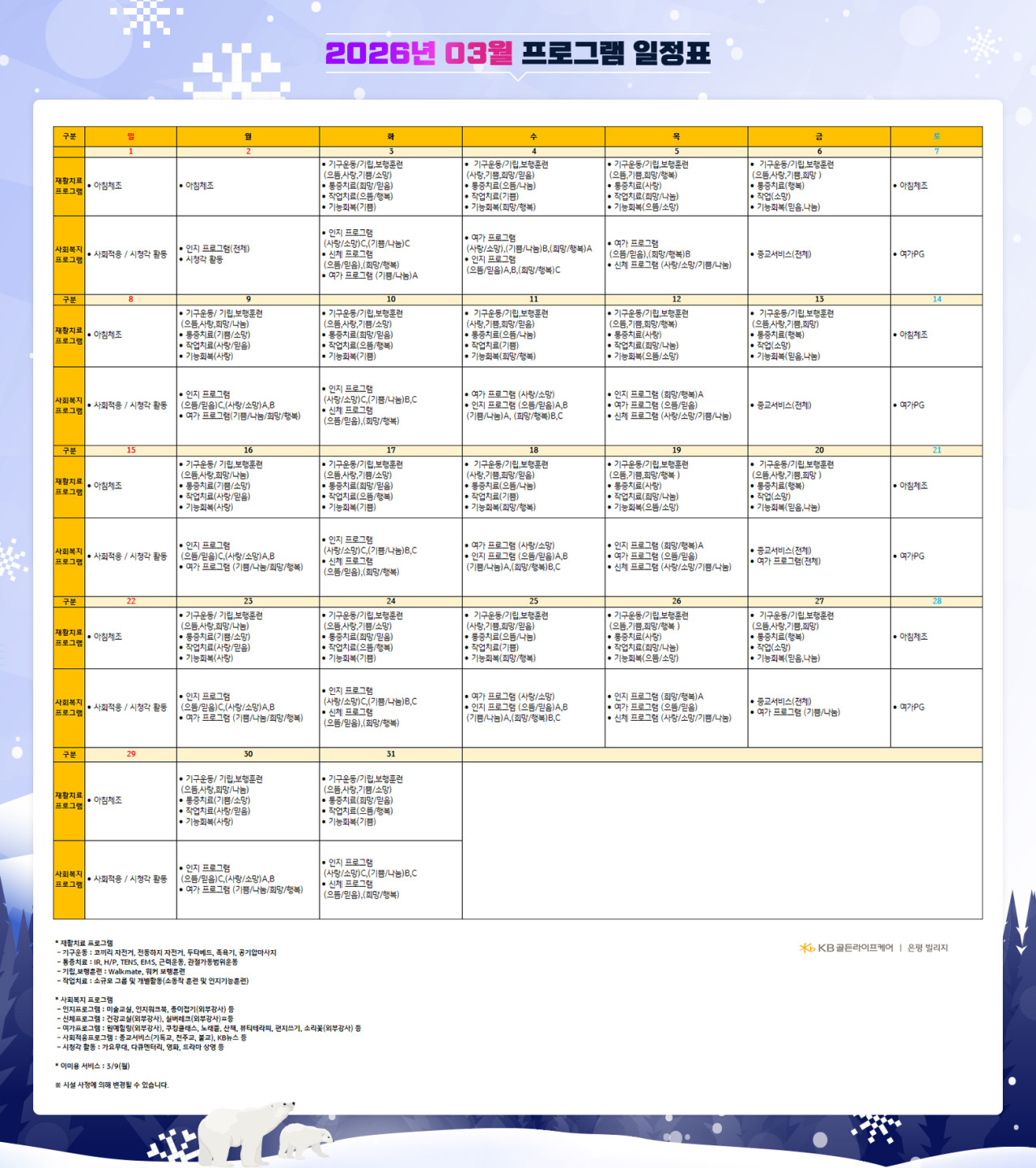 은평빌리지 [프로그램 안내] 2026년 은평 빌리지 3월 프로그램 일정표 페이지 정보 작성자 최고관리자 댓글 0건 조회 53회 작성일 26-03-04 13:48 목록 본문 . 목록 이전글[프로그램 안내] 2026년 은평케어센터 3월 프로그램 일정표 26.03.04 다음글[식단안내] 2026년 3월 1주차 식단표 26.03.03