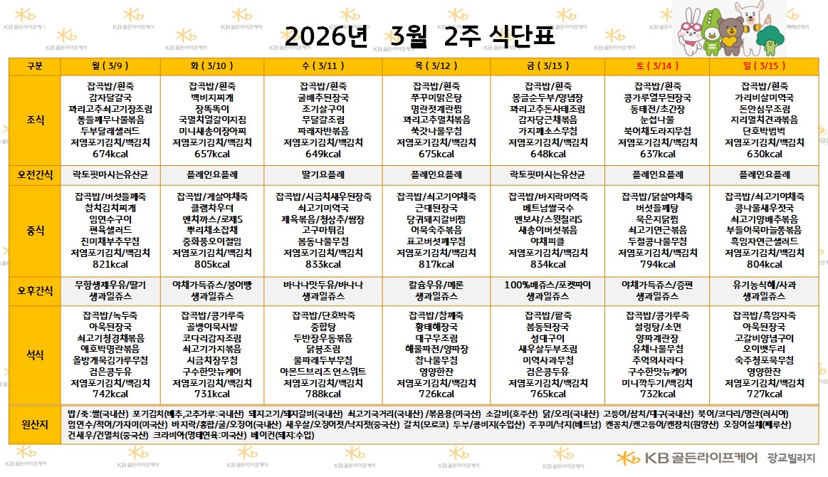 광교빌리지 [식단안내] 2026년 3월 2주 식단표 페이지 정보 작성자 최고관리자 댓글 0건 조회 20회 작성일 26-03-06 12:36 목록 본문 목록 이전글[식단안내] 2026년 3월 2주차 식단표 26.03.06 다음글[하루의 식단] 2026년 3월 5일 26.03.06