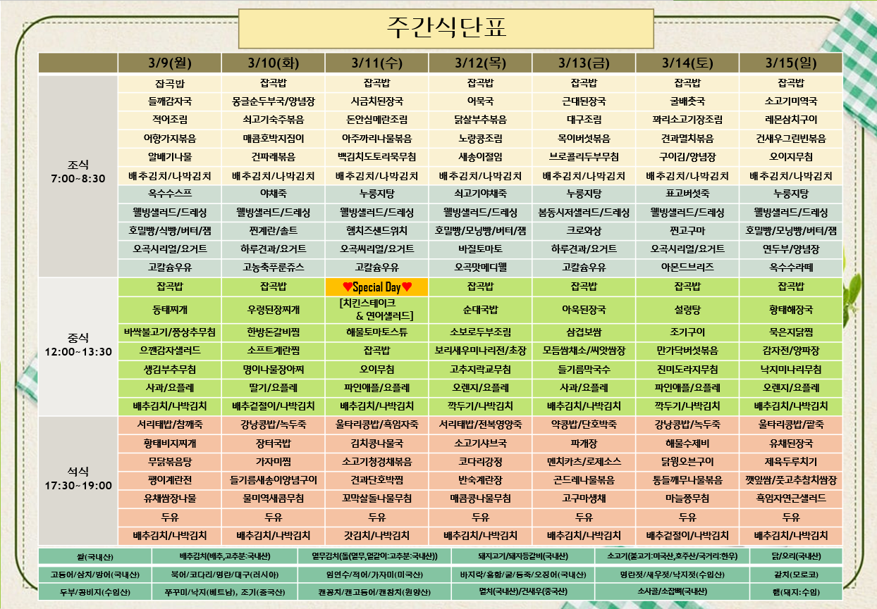 평창카운티 [식단안내] 2026년 3월 2주차 식단표 페이지 정보 작성자 최고관리자 댓글 0건 조회 30회 작성일 26-03-06 22:46 목록 본문 목록 이전글[하루의식단] 2026년 3월 6일 금요일 조/중/석식 26.03.07 다음글[하루의 식단] 2026년 3월 4일 (조/중/석) 26.03.06