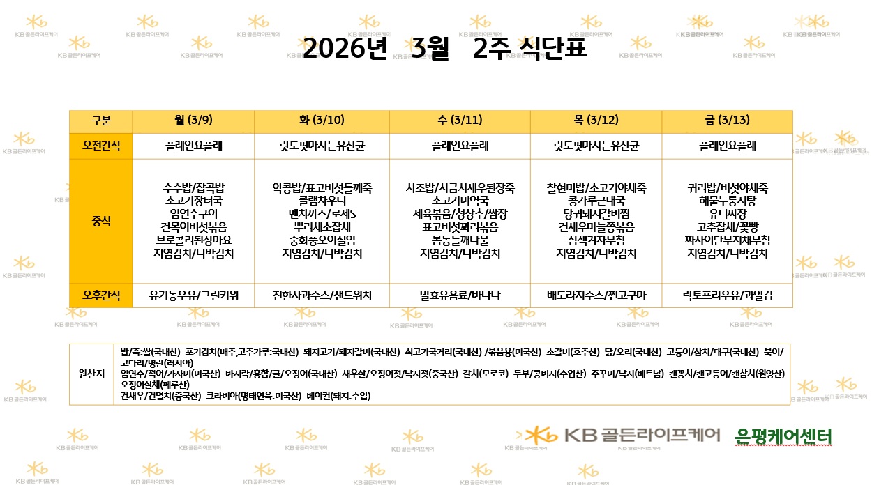 은평케어센터 [식단안내] 2026년 3월 2주차 식단표 페이지 정보 작성자 최고관리자 댓글 0건 조회 46회 작성일 26-03-07 12:21 목록 본문 목록 이전글[식단안내 ] 서초빌리지 3월 2주 식단표 26.03.09 다음글[오늘의식단] 2026년 3월 3일 중식 26.03.07