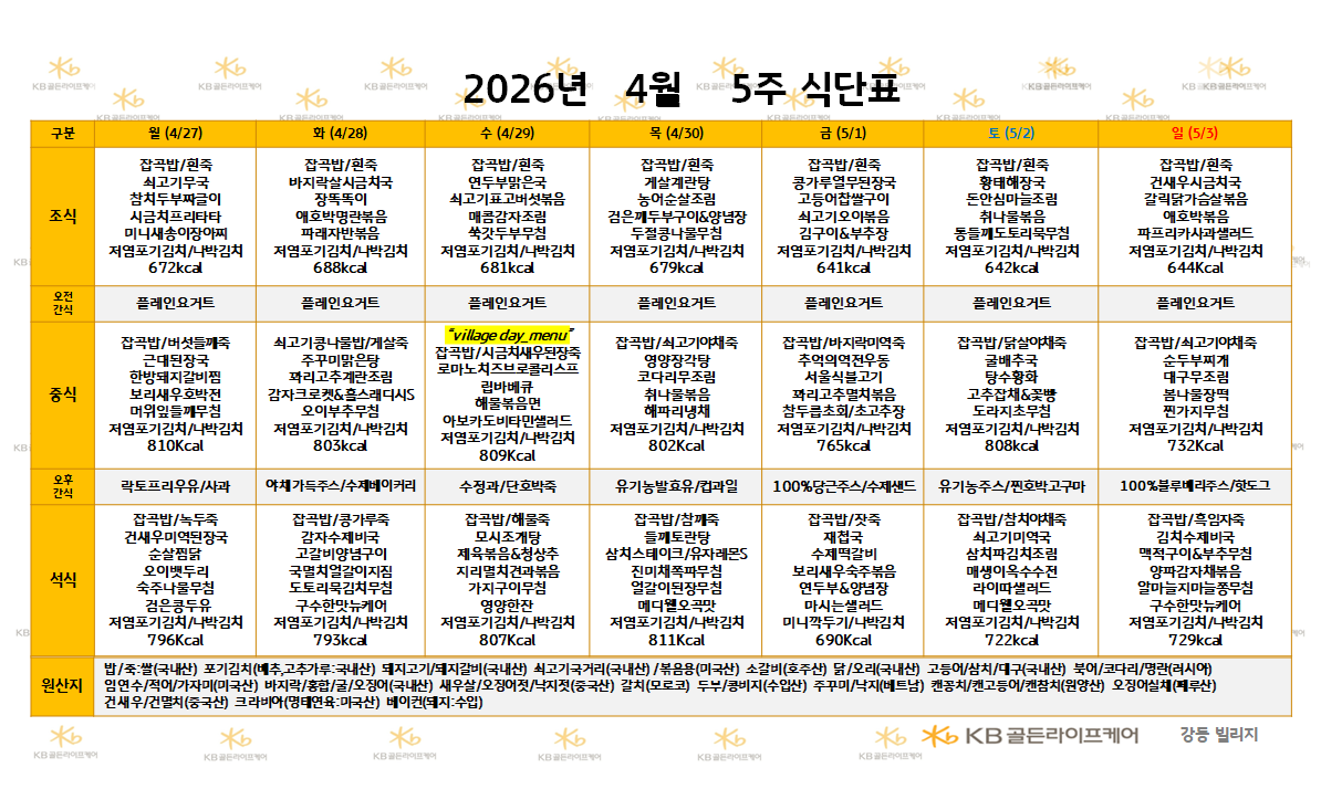 강동빌리지 [식단안내] 2026년 4월 5주 식단표 페이지 정보 작성자 최고관리자 댓글 0건 조회 3회 작성일 26-04-24 17:14 목록 본문 목록 이전글[식단안내] 2026년 4월 5주 식단표 26.04.24 다음글[식단안내] 2026년 4월 5주차 식단표 26.04.23