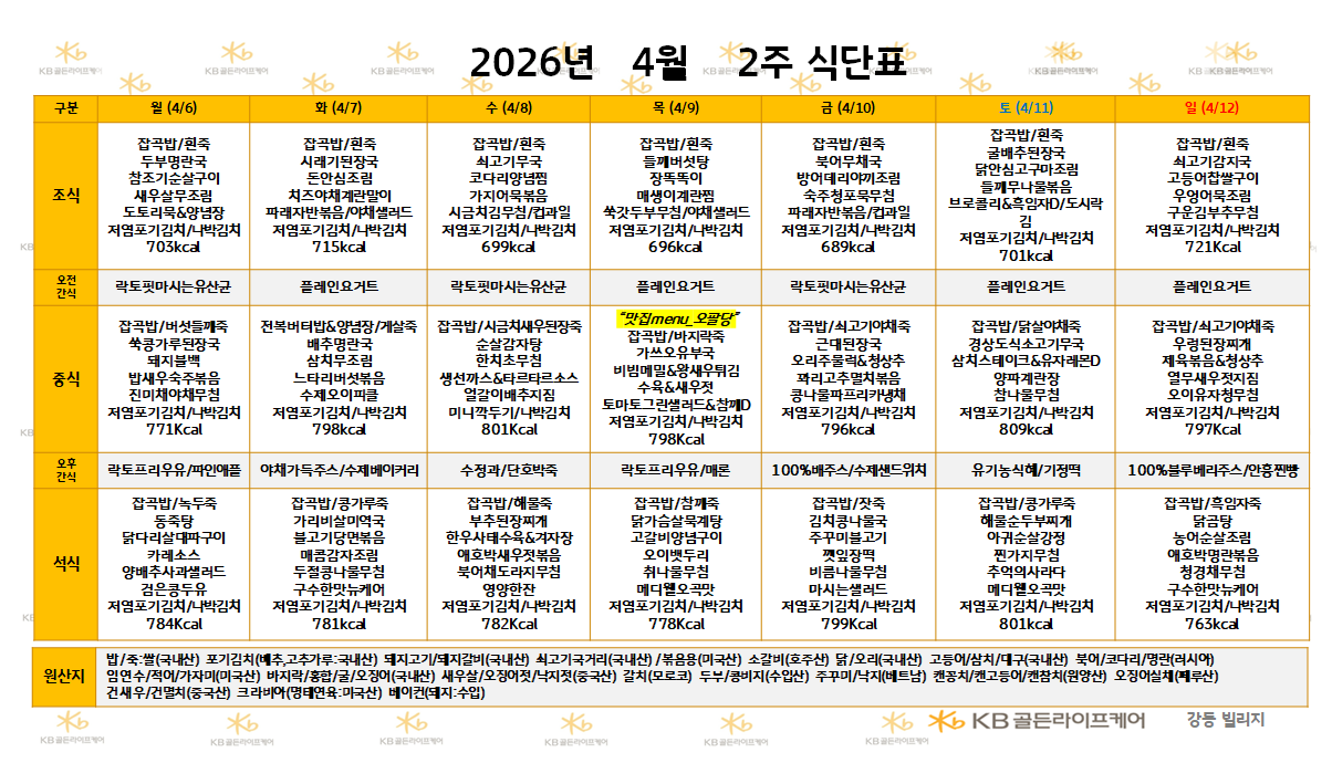 강동빌리지 [식단안내] 2026년 4월 2주 식단표 페이지 정보 작성자 최고관리자 댓글 0건 조회 89회 작성일 26-04-03 18:00 목록 본문 목록 이전글[식단안내] 2026년 4월 2주 식단표 26.04.03 다음글[식단안내] 2026년 4월 2주차 식단표 26.04.02