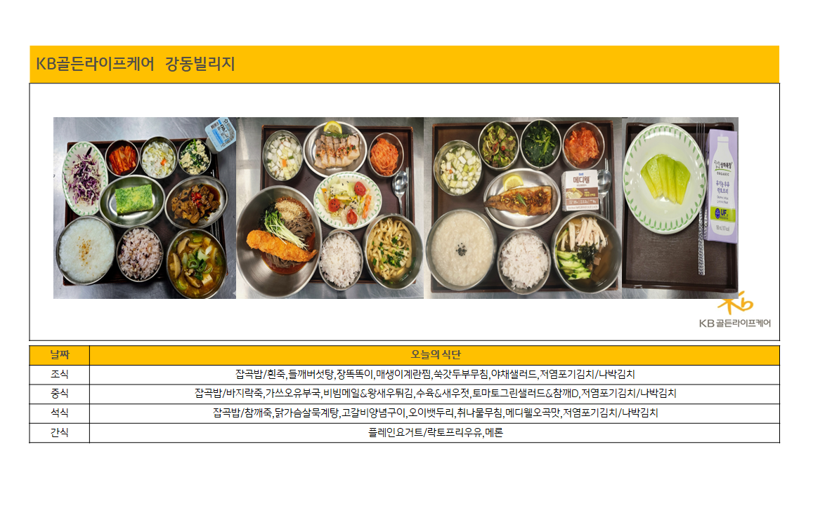 강동빌리지 [하루의 식단]강동빌리지 4월 9일 목요일 페이지 정보 작성자 최고관리자 댓글 0건 조회 17회 작성일 26-04-10 14:36 목록 본문 목록 이전글[식단안내] 2026년 4월 3주 식단표 26.04.10 다음글[하루의 식단]강동빌리지 4월 3일 금요일 26.04.10