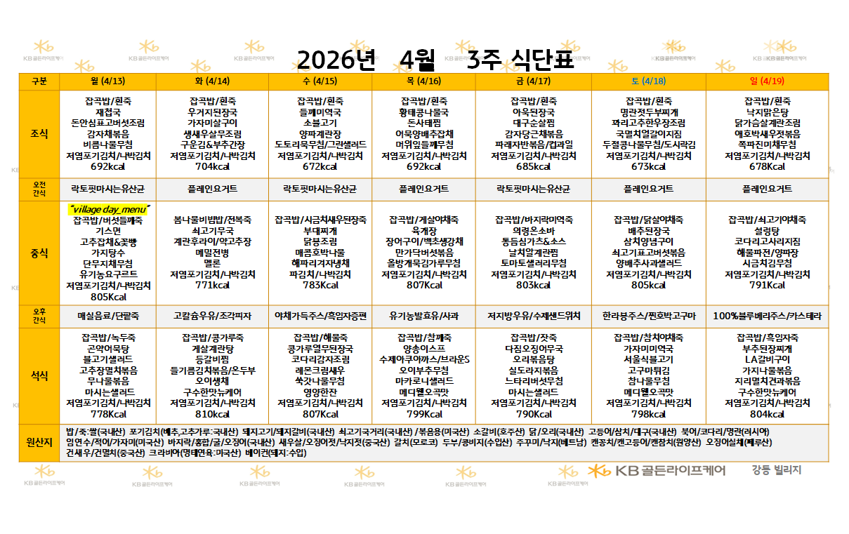 강동빌리지 [식단안내] 2026년 4월 3주 식단표 페이지 정보 작성자 최고관리자 댓글 0건 조회 15회 작성일 26-04-10 14:42 목록 본문 목록 이전글[식단안내] 2026년 4월 3주 식단표 26.04.10 다음글[하루의 식단]강동빌리지 4월 9일 목요일 26.04.10