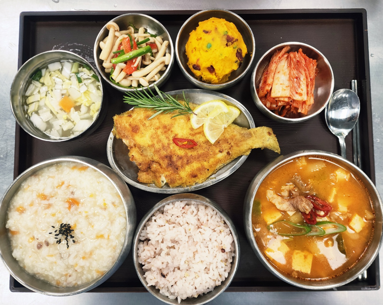 잡곡밥/쇠고기야채죽,차돌박이된장찌개,가자미양념구이,만가닥버섯피망볶음,단호박샐러드,저염포기김치/나박김치