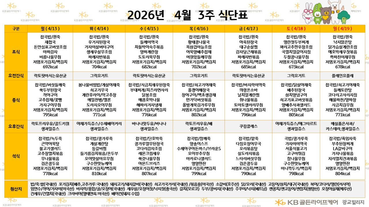 광교빌리지 [식단안내] 2026년 4월 3주차 식단표 페이지 정보 작성자 최고관리자 댓글 0건 조회 19회 작성일 26-04-10 17:09 목록 본문 목록 이전글[식단안내] 2026년 4월 3주 식단표 26.04.10 다음글[오늘의 식단] 26년 4월 9일 목요일 중식 26.04.10