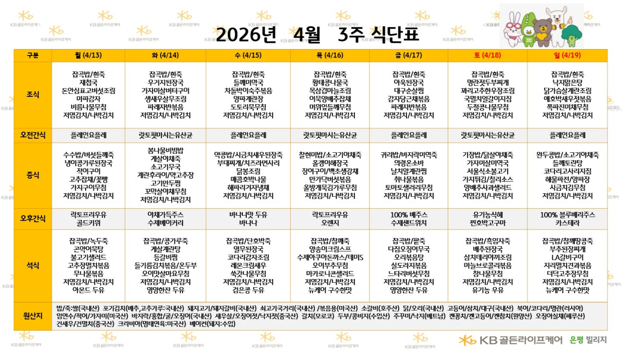 은평빌리지 [식단안내] 2026년 4월 3주차 식단표 페이지 정보 작성자 최고관리자 댓글 0건 조회 13회 작성일 26-04-11 16:04 목록 본문 목록 이전글[오늘의식단] 2026년 4월 7일 중식 26.04.11 다음글[하루의식단] 2026년 4월 9일 조식/중식/석식 26.04.11