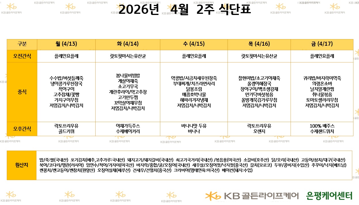 은평케어센터 [식단안내] 2026년 4월 3주차 식단표 페이지 정보 작성자 최고관리자 댓글 0건 조회 2회 작성일 26-04-11 21:41 목록 본문 목록 이전글[식단안내] 2026년 4월 3주차 식단표 26.04.13 다음글[오늘의식단] 2026년 4월 7일 중식 26.04.11