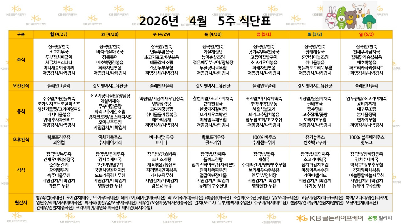 은평빌리지 [식단안내] 2026년 4월 5주차 식단표 페이지 정보 작성자 최고관리자 댓글 0건 조회 26회 작성일 26-04-25 10:16 목록 본문 목록 이전글[하루의 식단] 2026년 4월 22일 (조/중/석) 26.04.25 다음글[오늘의식단] 2026년 4월 23일 조/중/석식 26.04.25