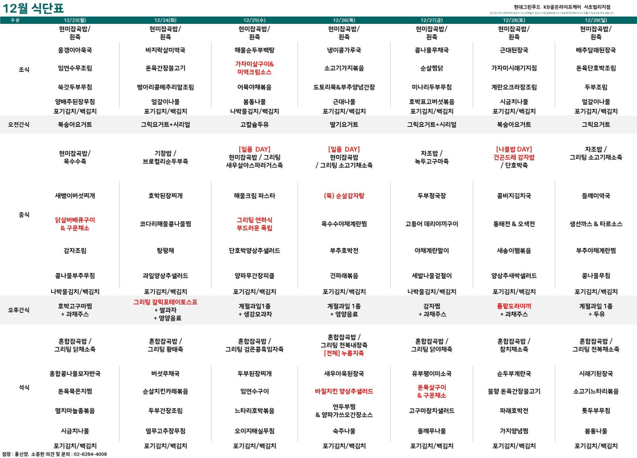 서초빌리지 [식단안내] 서초 빌리지 12월 4주차 식단표 페이지 정보 작성자 KB 골든라이프케어 댓글 0건 조회 2,360회 작성일 24-12-19 17:10 목록 본문 목록 이전글[오늘의 식단] 2024년 12월 20일 석식 24.12.20 다음글[오늘의 식단] 2024년 12월 16일 중식 24.12.16