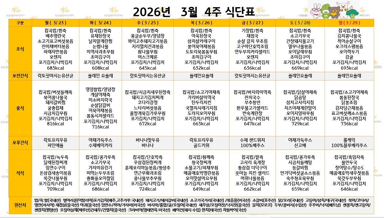 위례빌리지 [식단안내] 2026년 3월 4주차 식단표 페이지 정보 작성자 최고관리자 댓글 0건 조회 14회 작성일 26-03-19 17:45 목록 본문 목록 이전글[하루의 식단] 2026년 3월 19일 26.03.20 다음글[식단안내] 2026년 3월 4주차 식단표 26.03.19