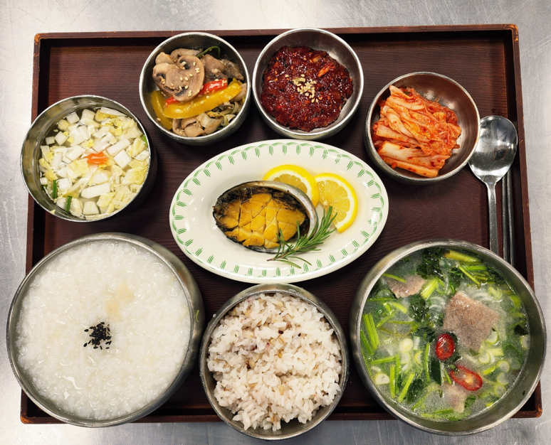 잡곡밥/가리비죽,미나리곰탕,전복버터구이,모듬버섯파프리카볶음,씨앗젓갈무침,검은콩두유,저염포기김치/나박김치