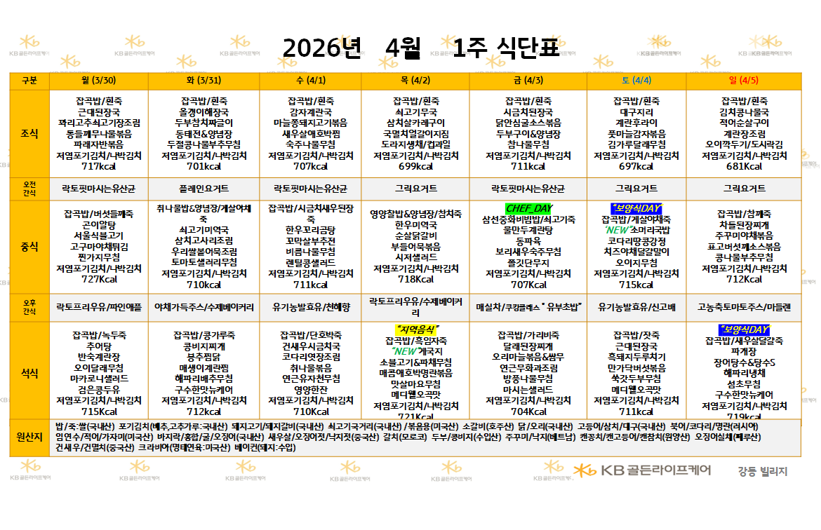 강동빌리지 [식단안내] 2026년 3월 4주 식단표 페이지 정보 작성자 최고관리자 댓글 0건 조회 34회 작성일 26-03-20 17:18 목록 본문 목록 이전글[식단안내] 2026년 3월 4주 식단표 26.03.20 다음글[식단안내] 2026년 3월 4주 식단표 26.03.20