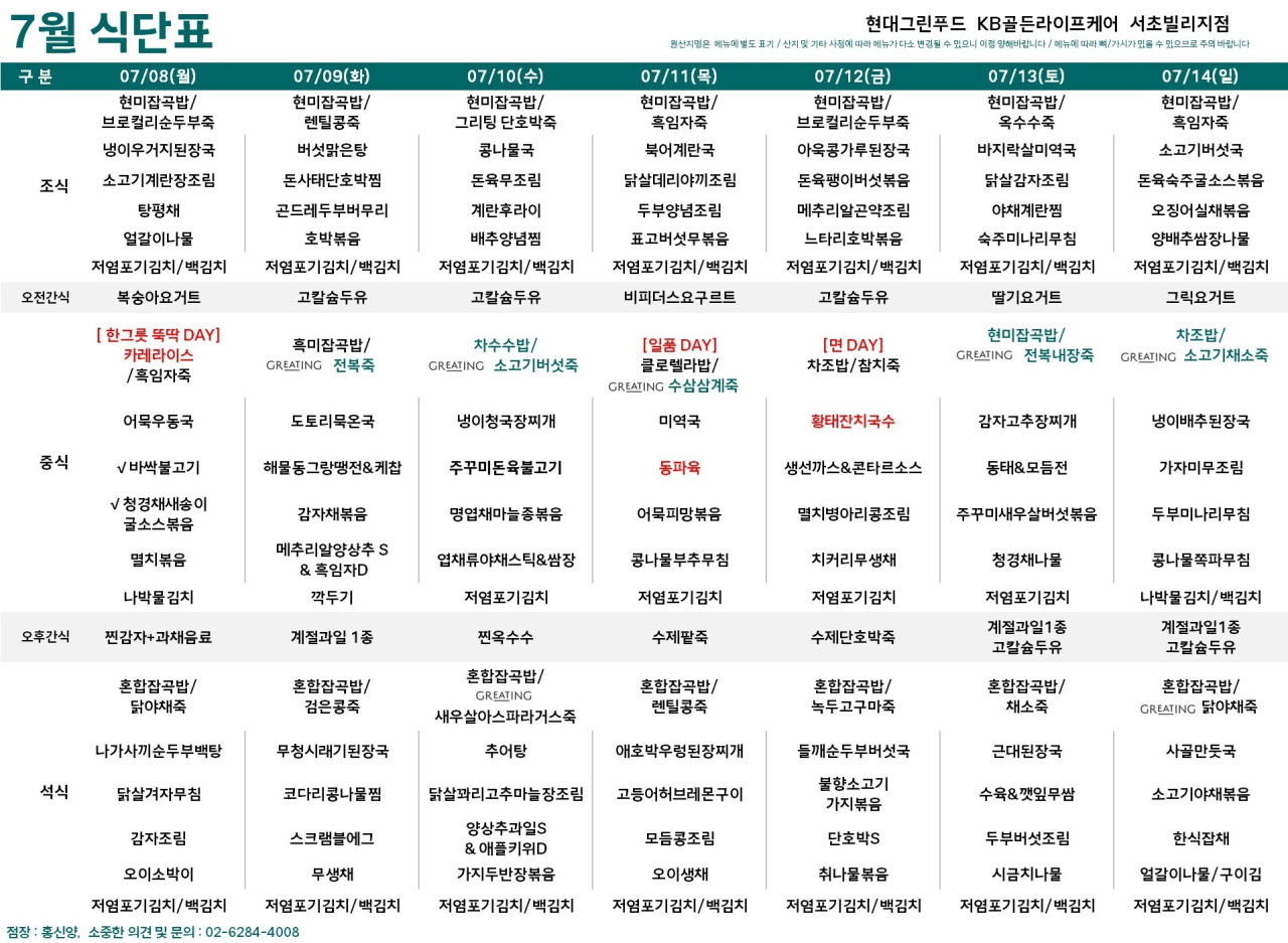 서초빌리지 [식단안내] 서초 빌리지 7월 2주차 식단표 페이지 정보 작성자 KB 골든라이프케어 댓글 0건 조회 2,151회 작성일 24-07-04 21:44 목록 본문 목록 이전글[오늘의 식단] 2024년 07월 05일 중식 24.07.05 다음글[식단안내] 위례 빌리지 7월 2주차 식단표 24.07.04