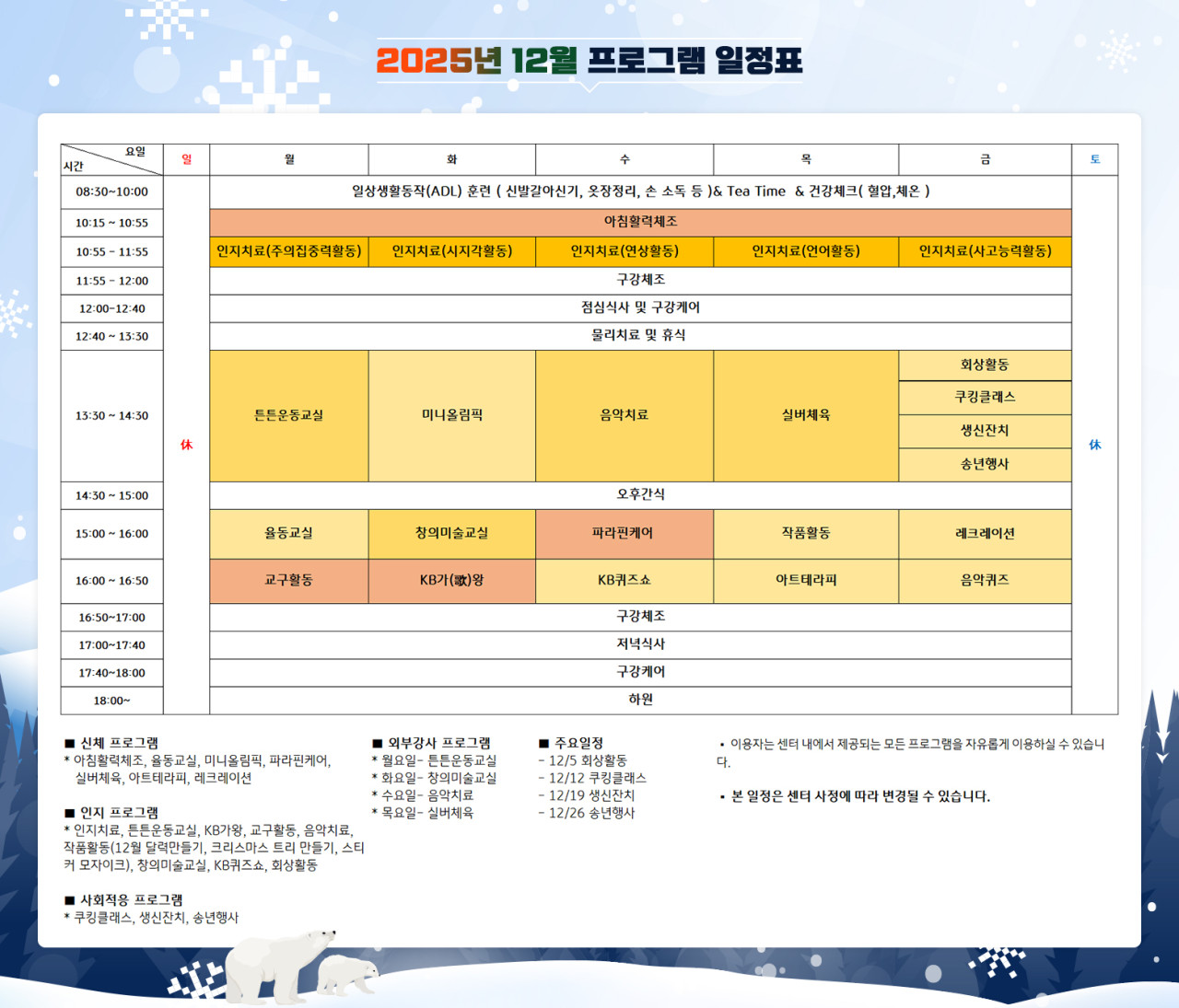 강동케어센터 [프로그램 안내] 2025년 강동케어센터 12월 프로그램 일정표 페이지 정보 작성자 최고관리자 댓글 0건 조회 4회 작성일 25-12-21 21:10 목록 본문 목록 이전글[식단안내] 2025년 12월 4주차 식단안내 25.12.22 다음글[식단안내] 2025년 12월 4째주 식단표 25.12.20