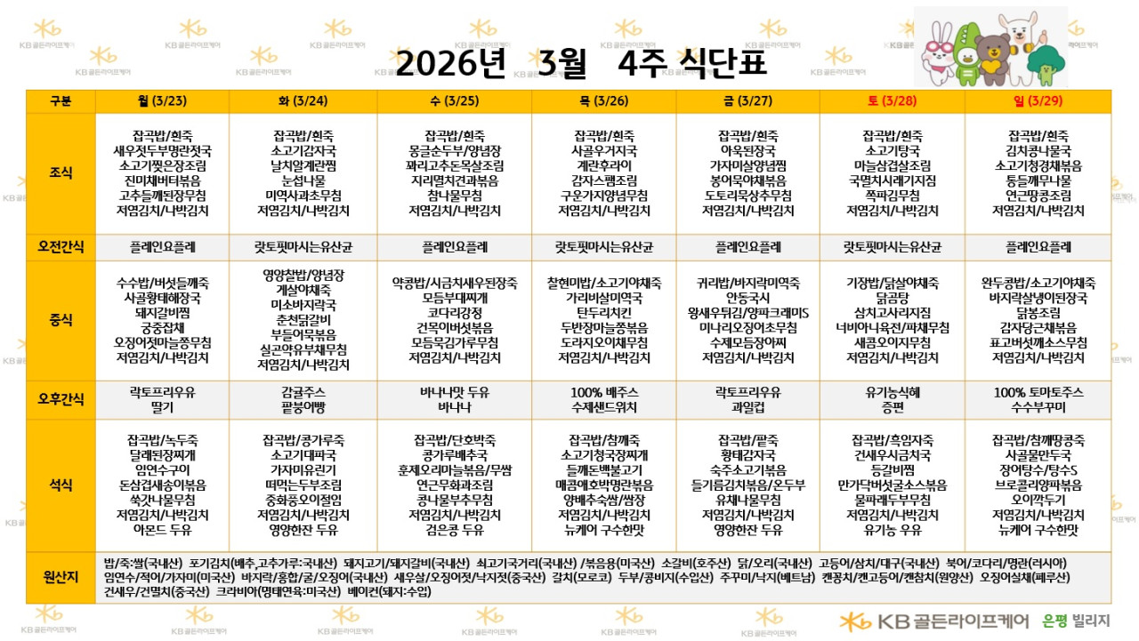 은평빌리지 [식단안내] 2026년 3월 4주차 식단표 페이지 정보 작성자 최고관리자 댓글 0건 조회 6회 작성일 26-03-21 00:42 목록 본문 목록 이전글[하루의 식단] 2026년 3월 18일 (조/중/석) 26.03.21 다음글[하루의식단] 2026년 3월 20일 조/중/석식 26.03.21