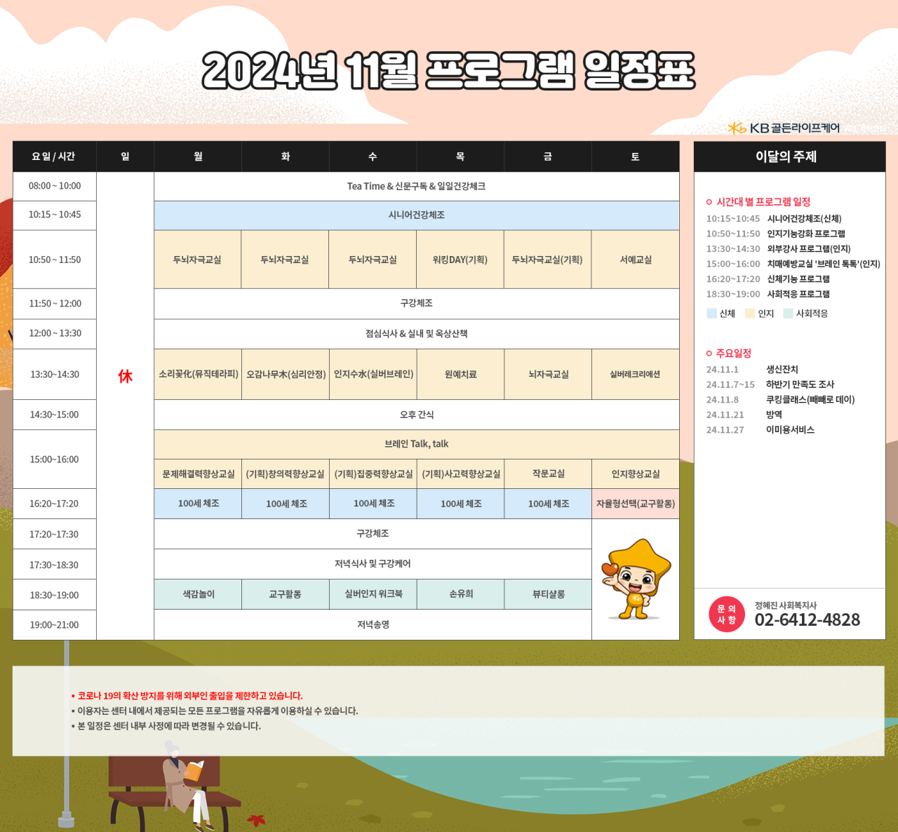 위례케어센터 [프로그램 안내] 2024년 위례케어센터 11월 프로그램 일정표 페이지 정보 작성자 KB 골든라이프케어 댓글 0건 조회 3,006회 작성일 24-10-30 17:34 목록 본문 목록 이전글[오늘의 식단] 2024년 10월 31일 중식 24.10.31 다음글[하루의 식단] 2024년 10월 28일 24.10.28
