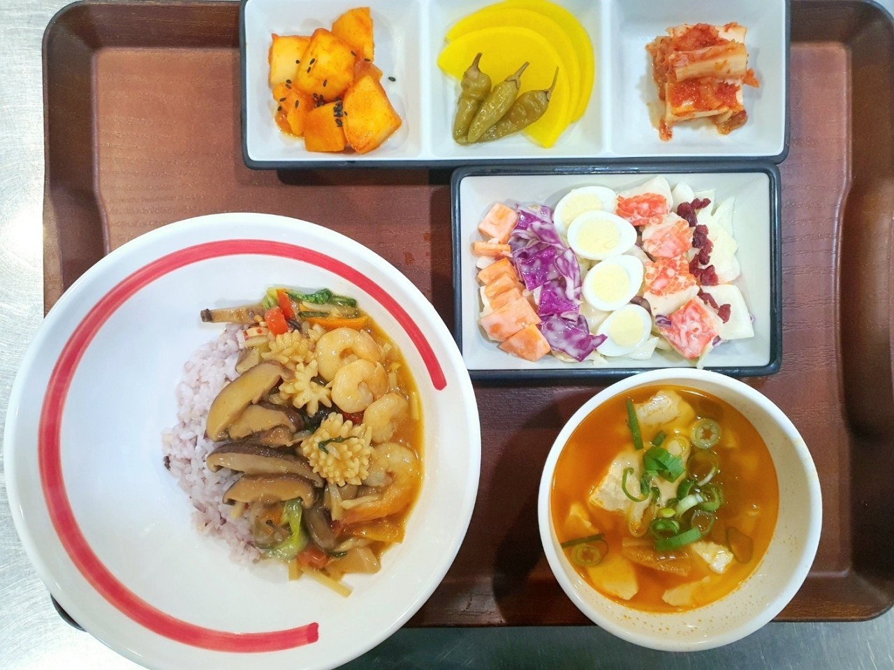 강동케어센터 [오늘의 식단] 2024년 10월 31일 중식 페이지 정보 작성자 KB 골든라이프케어 댓글 0건 조회 2,224회 작성일 24-10-31 12:06 목록 본문 안녕하세요. 10.31 중식제공식단입니다. [일품덮밥 DAY] 팔보채덮밥 / 양상추꽃맛살메추리알샐러드 / 감자조림 / 단무지&산고추지 / 포기김치 / 순두부김치국 팔보채덮밥은 오징어, 새우, 죽순, 새송이버섯, 표고버섯, 목이버섯, 청경채, 부추, 양배추, 양파, 당근, 청피망, 홍피망, 청양고추 등 다양한 재료를 넣어 덮밥요리로 제공드렸습니다. **KB골든라이프케어 강동점은 현대그린푸드에서 운영하는 시니어 대상 급식사업장 입니다.** 목록 이전글[하루의 식단] 2024년 10월 29일 하루 24.10.31 다음글[프로그램 안내] 2024년 위례케어센터 11월 프로그램 일정표 24.10.30