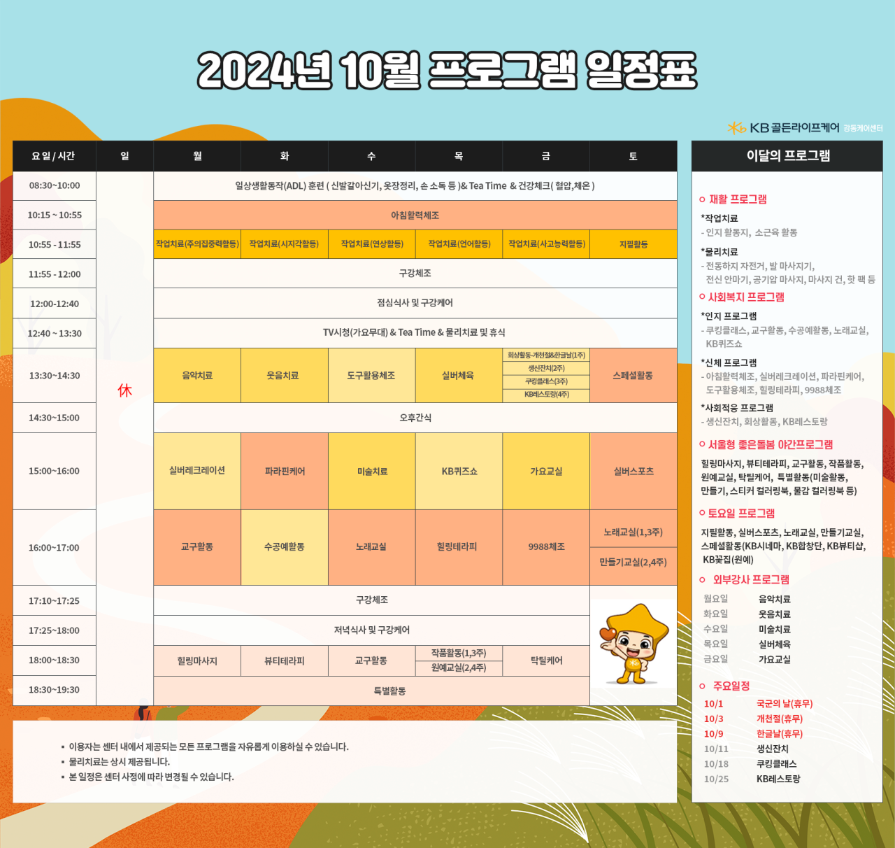 강동케어센터 [프로그램안내] 2024년 강동케어센터 10월 프로그램 일정표 페이지 정보 작성자 KB 골든라이프케어 댓글 0건 조회 3,031회 작성일 24-09-28 15:02 목록 본문 목록 이전글[식단안내] 2024년 강동케어센터 10월 식단표 24.09.28 다음글[하루의 식단] 2024년 10월 27일 24.09.28