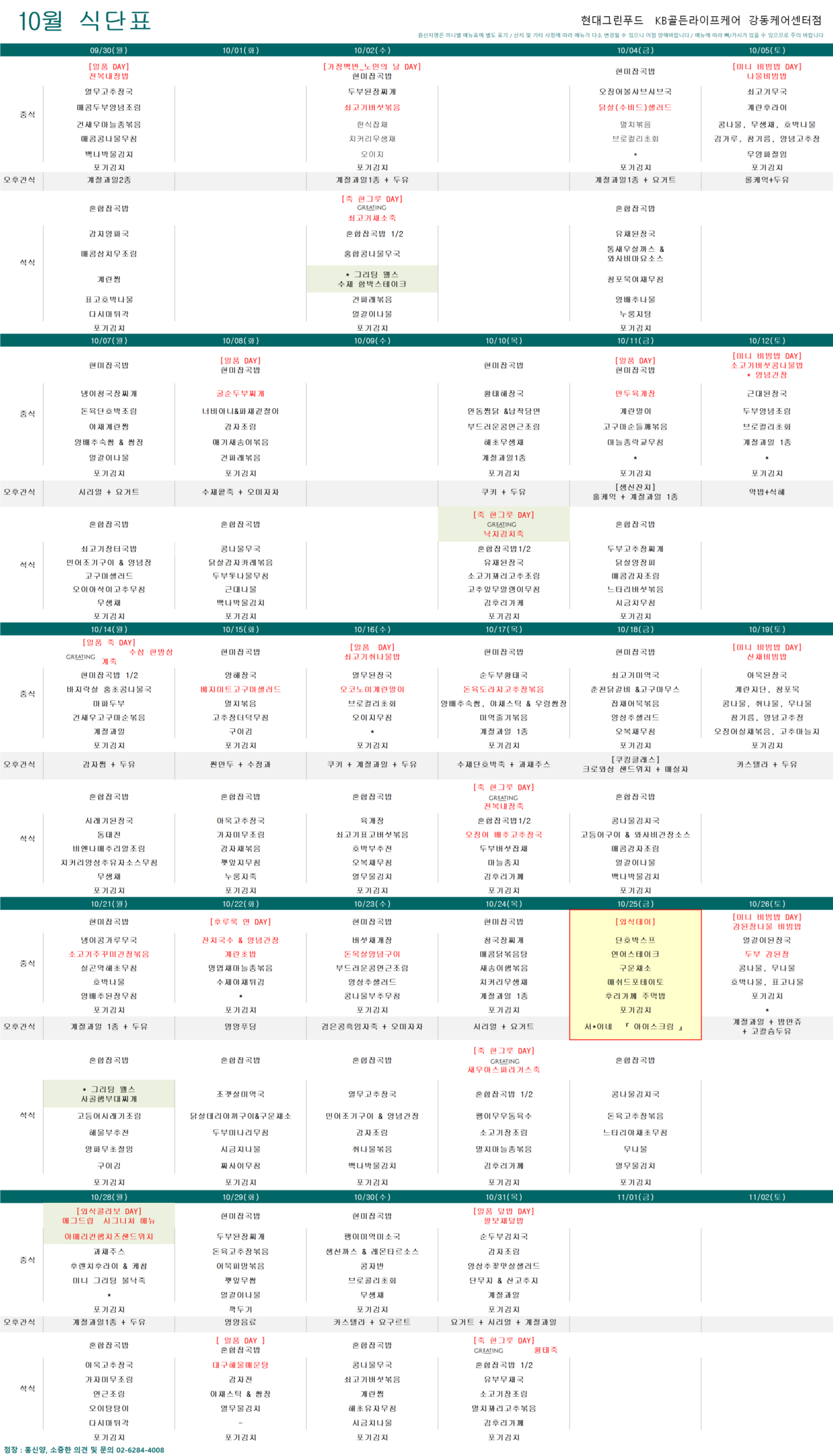 강동케어센터 [식단안내] 2024년 강동케어센터 10월 식단표 페이지 정보 작성자 KB 골든라이프케어 댓글 0건 조회 3,185회 작성일 24-09-28 15:02 목록 본문 목록 이전글[오늘의 식단] 2024년 9월 30일 중식 24.09.30 다음글[프로그램안내] 2024년 강동케어센터 10월 프로그램 일정표 24.09.28