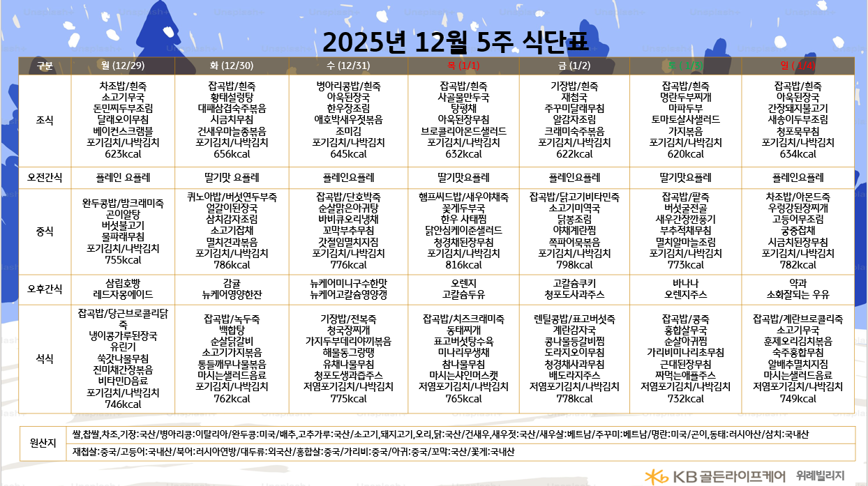 위례빌리지 [식단안내] 2025년 12월 5주차 식단표 페이지 정보 작성자 최고관리자 댓글 0건 조회 5회 작성일 25-12-26 17:28 목록 본문 목록 이전글[식단안내]강동빌리지 12월 5주차 주간식단표 25.12.26 다음글[식단안내] 2025년 12월 5주차 식단표 25.12.26