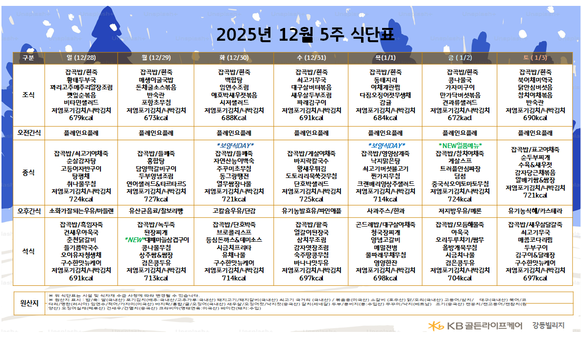 강동빌리지 [식단안내]강동빌리지 12월 5주차 주간식단표 페이지 정보 작성자 최고관리자 댓글 0건 조회 2회 작성일 25-12-26 19:09 목록 본문 목록 이전글[식단안내]강동케어센터 12월 5주차 주간식단표 25.12.26 다음글[식단안내] 2025년 12월 5주차 식단표 25.12.26
