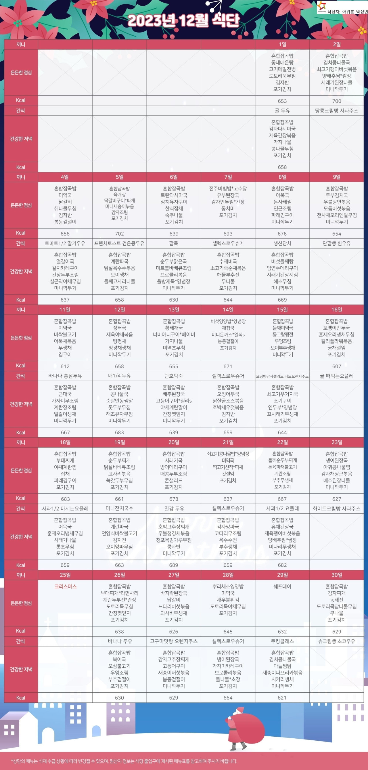 강동케어센터 [식단안내] 2023년 강동케어센터 12월 식단표 페이지 정보 작성자 KB 골든라이프케어 댓글 0건 조회 2,485회 작성일 23-11-30 16:33 목록 본문 목록 이전글[오늘의 식단] 2023년 11월 30일 목요일 23.11.30 다음글[프로그램 안내] 2023년 강동케어센터 12월 프로그램 일정표 23.11.30