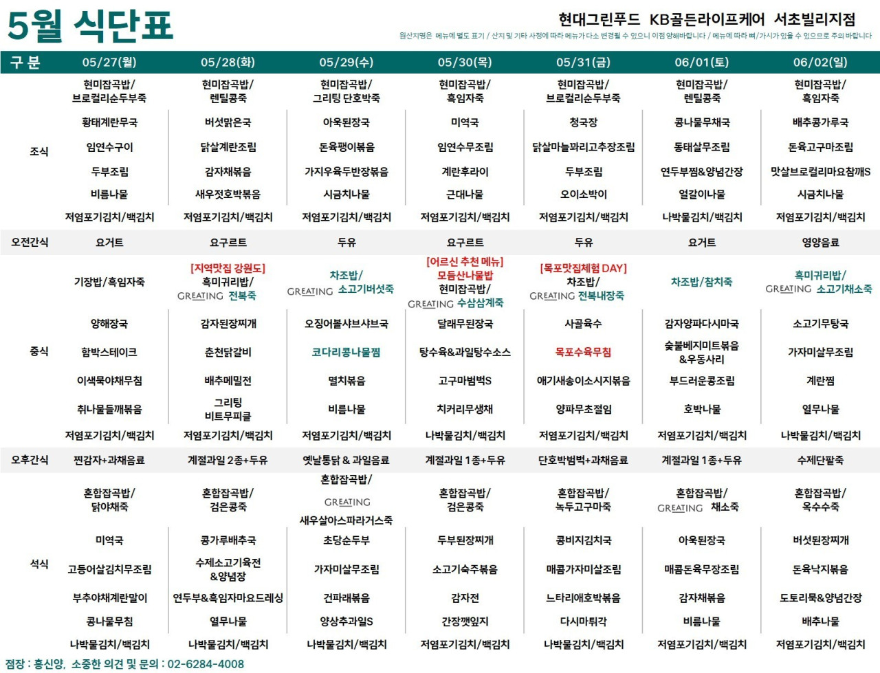 서초빌리지 [식단안내] 서초빌리지 6월 1주차 식단표 페이지 정보 작성자 KB 골든라이프케어 댓글 0건 조회 1,980회 작성일 24-05-27 11:06 목록 본문 목록 이전글[오늘의 식단] 2024년 5월 27일 중식/석식 24.05.27 다음글[하루의 식단] 2024년 5월 25일 24.05.26
