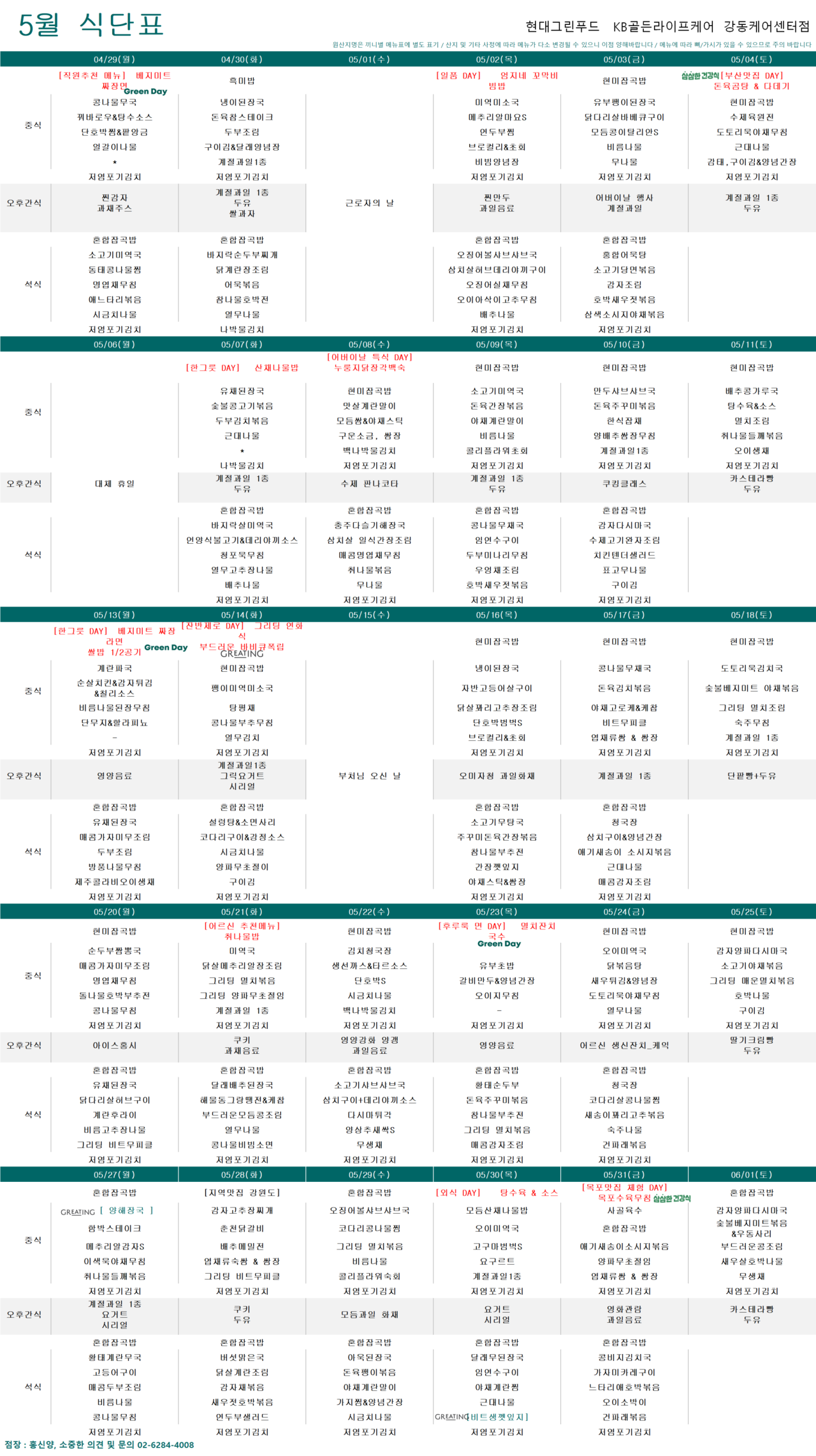 강동케어센터 [식단안내] 2024년 강동케어센터 5월 식단표 페이지 정보 작성자 KB 골든라이프케어 댓글 0건 조회 2,659회 작성일 24-04-30 17:56 목록 본문 목록 이전글[오늘의 식단] 2024년 4월 30일 중식 24.05.01 다음글[프로그램 안내] 2024년 강동케어센터 5월 프로그램 일정표 24.04.30