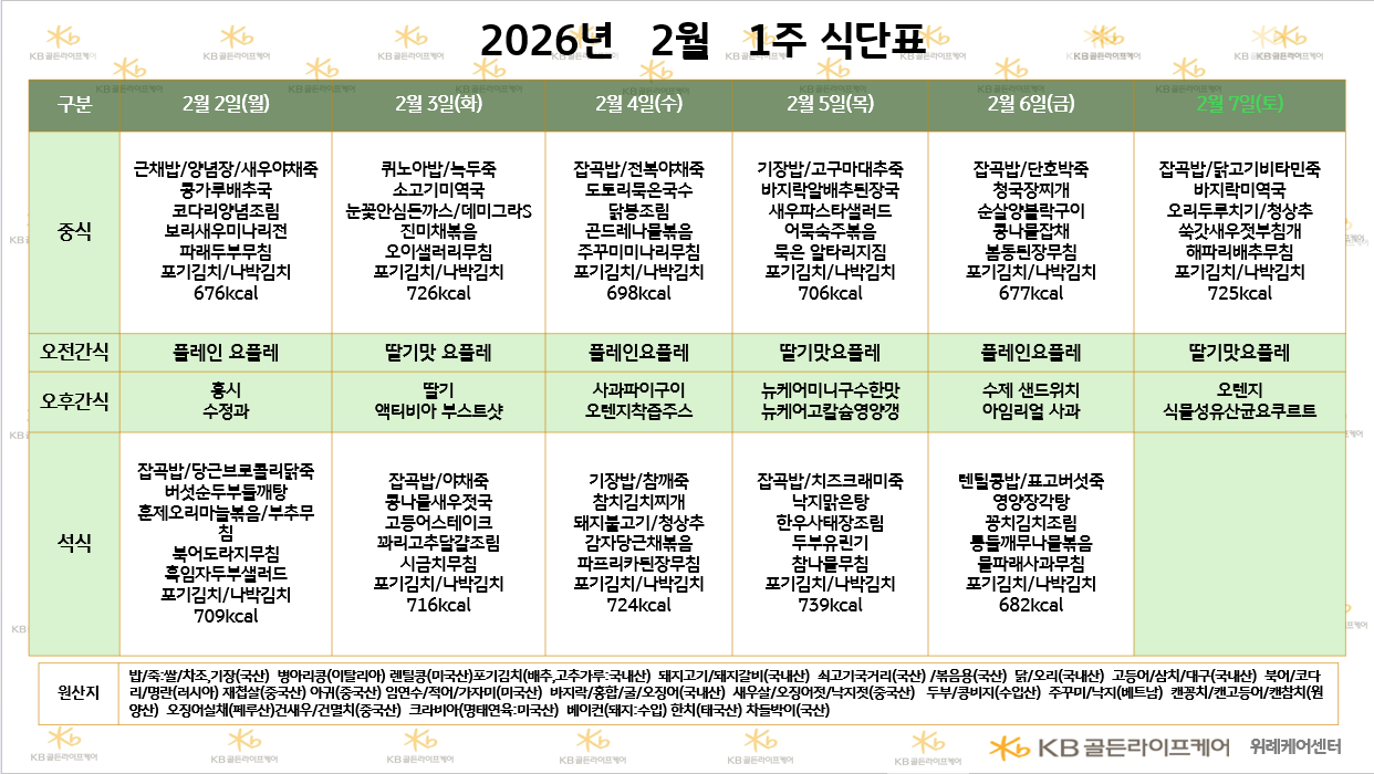위례케어센터 [식단안내] 2026년 2월 1주차 식단표 페이지 정보 작성자 최고관리자 댓글 0건 조회 4회 작성일 26-01-29 09:38 목록 본문 목록 이전글[식단안내] 2026년 2월 1주차 식단표 26.01.29 다음글[하루의 식단] 2026년 1월 28일 (조/중/석) 26.01.28