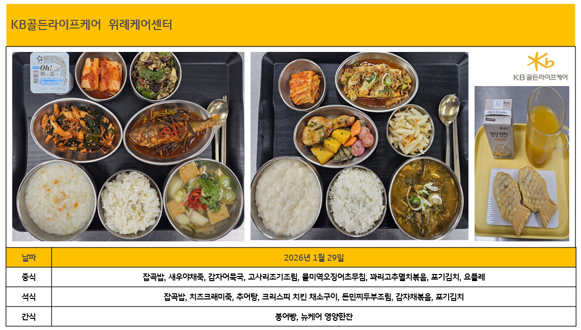 위례케어센터 [오늘의 식단] 2026년 1월 29일 중식 및 석식 페이지 정보 작성자 최고관리자 댓글 0건 조회 4회 작성일 26-01-30 08:31 목록 본문 목록 이전글[하루의 식단] 2026년 1월 28일 26.01.30 다음글[식단안내] 2026년 2월 1주차 식단표 26.01.29