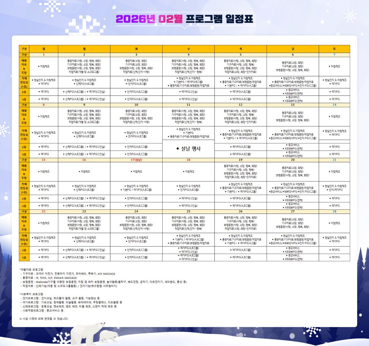 서초빌리지 [프로그램 안내] 2026년 서초 빌리지 2월 프로그램 일정표 페이지 정보 작성자 최고관리자 댓글 0건 조회 5회 작성일 26-01-30 14:22 목록 본문 목록 이전글[프로그램 안내]2026년 강동 케어센터 2월 프로그램 일정표 26.01.30 다음글[프로그램 안내]2026년 강동 빌리지 2월 프로그램 일정표 26.01.30