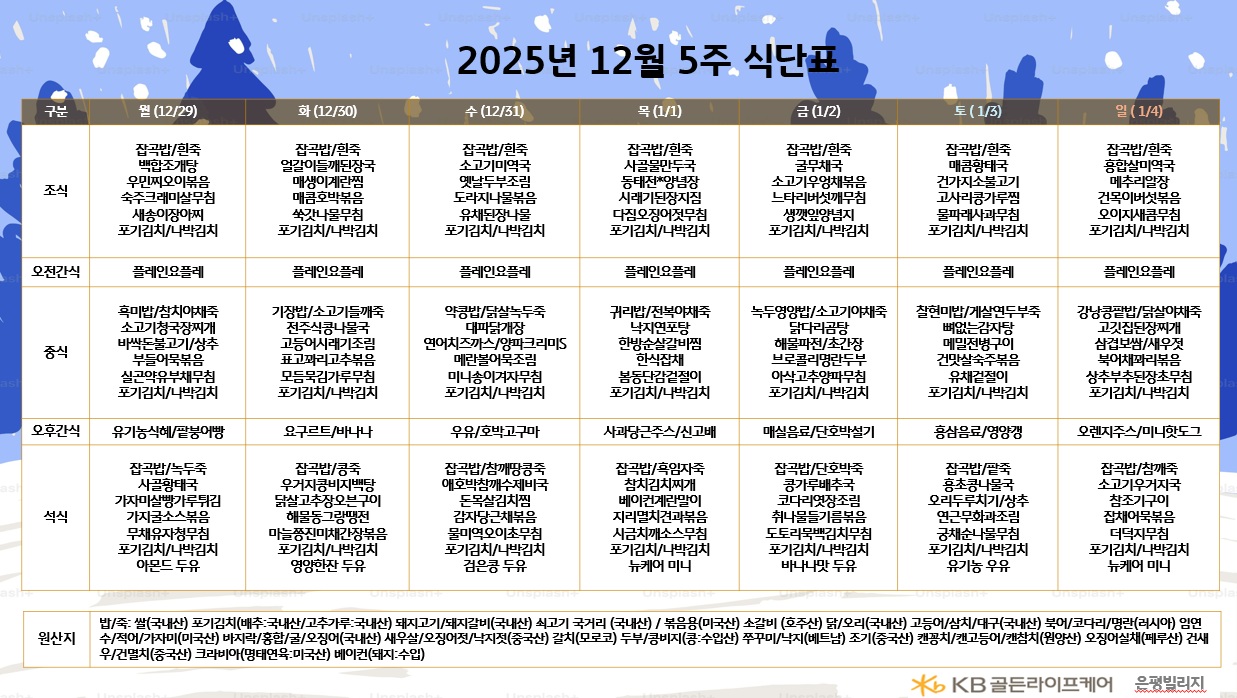 은평빌리지 [식단안내] 2025년 12월 5주 차 식단표 페이지 정보 작성자 최고관리자 댓글 0건 조회 1회 작성일 25-12-27 20:13 목록 본문 목록 다음글[식단안내] 2025년 12월 5주차 주간식단표 25.12.27