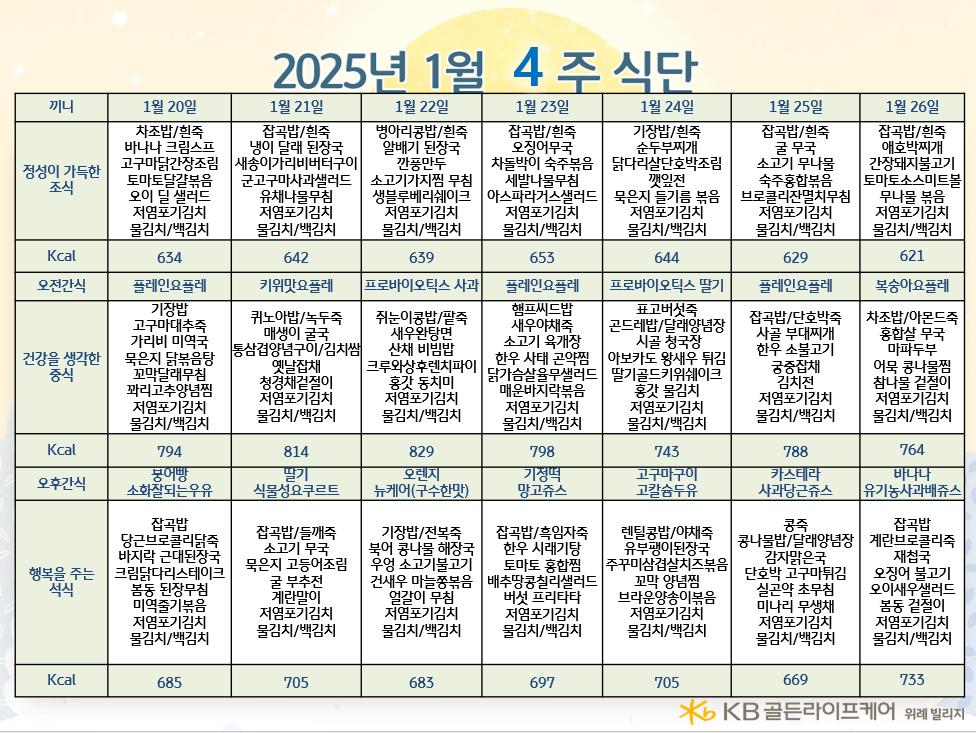 위례빌리지 [식단안내] 위례 빌리지 1월 4주차 식단표 페이지 정보 작성자 KB 골든라이프케어 댓글 0건 조회 2,986회 작성일 25-01-16 17:58 목록 본문 목록 이전글[식단안내] 서초 빌리지 25년 01월 4주차 식단표 25.01.17 다음글[식단안내] 위례 케어센터 1월 4주차 식단표 25.01.16