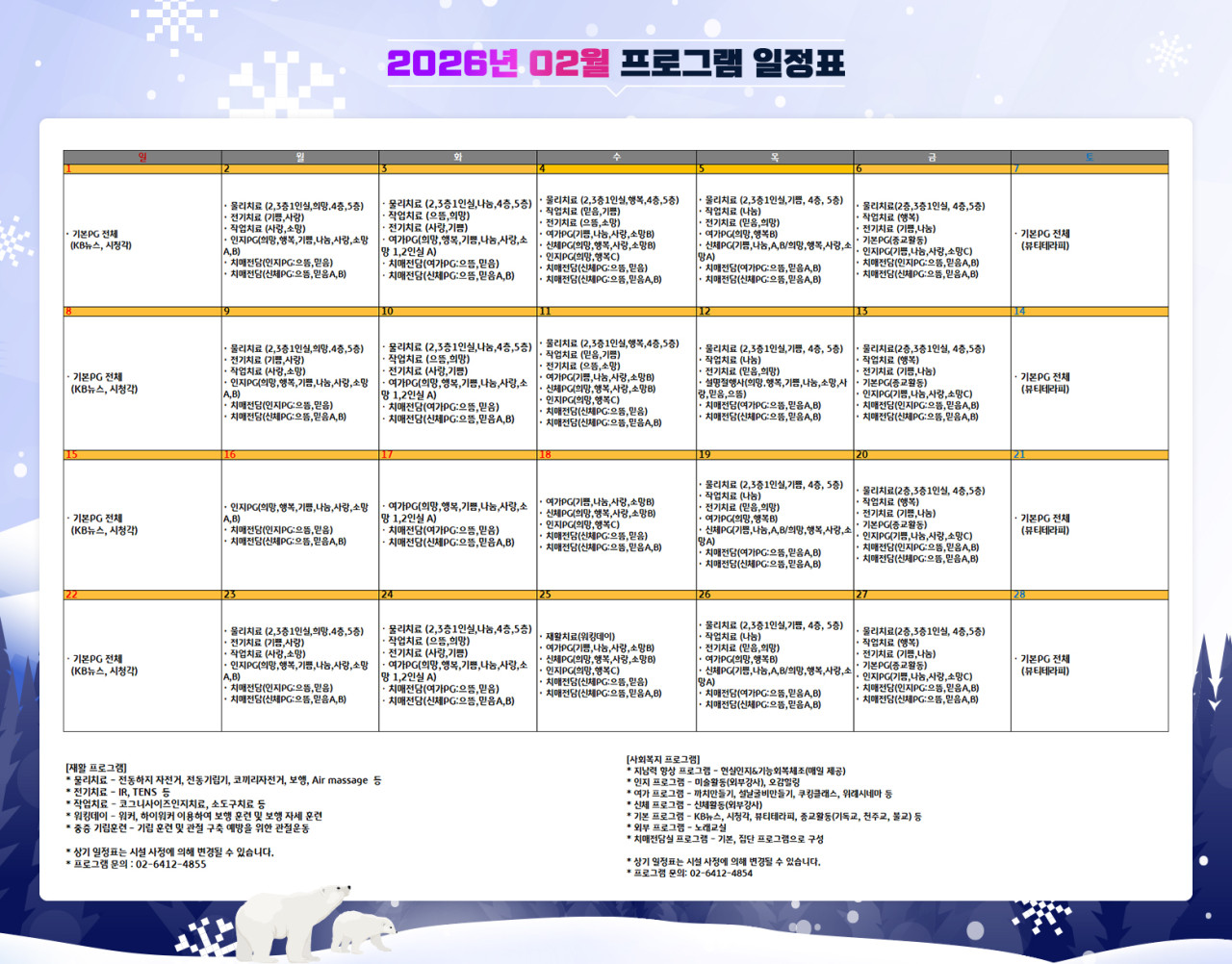 위례빌리지 [프로그램안내] 2026년 위례 빌리지 2월 프로그램 일정표 페이지 정보 작성자 최고관리자 댓글 0건 조회 31회 작성일 26-01-30 13:19 목록 본문 목록 이전글[프로그램 안내]2026년 강동 빌리지 2월 프로그램 일정표 26.01.30 다음글[프로그램 안내] 2026년 은평 빌리지 2월 프로그램 일정표 26.01.30