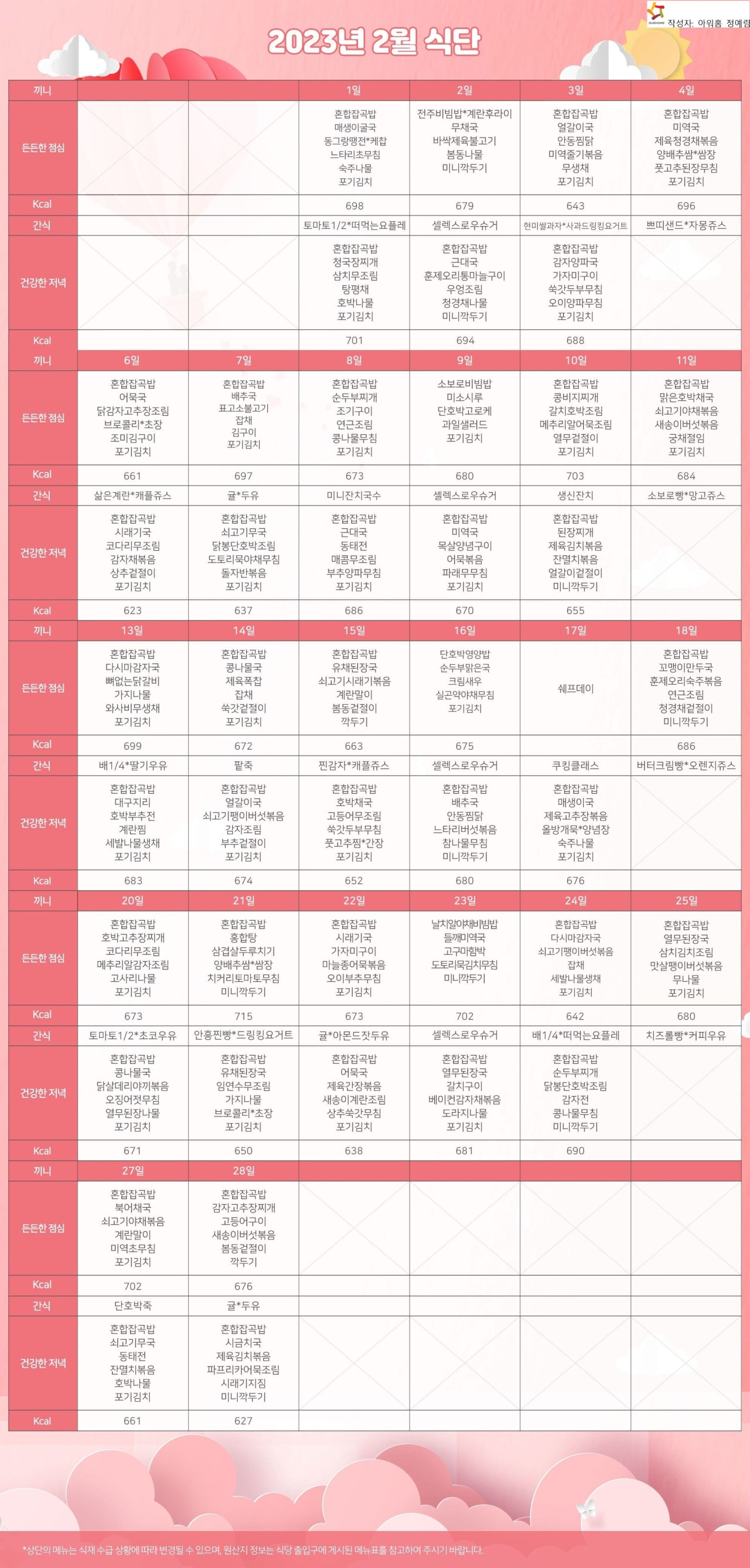 강동케어센터 [식단안내] 2023년 강동케어센터 2월 식단표 페이지 정보 작성자 KB 골든라이프케어 댓글 0건 조회 2,583회 작성일 23-01-31 09:59 목록 본문 목록 이전글[프로그램 안내] 2023년 위례케어센터 2월 프로그램 일정표 23.01.31 다음글[프로그램 안내] 2023년 강동케어센터 2월 프로그램 일정표 23.01.31