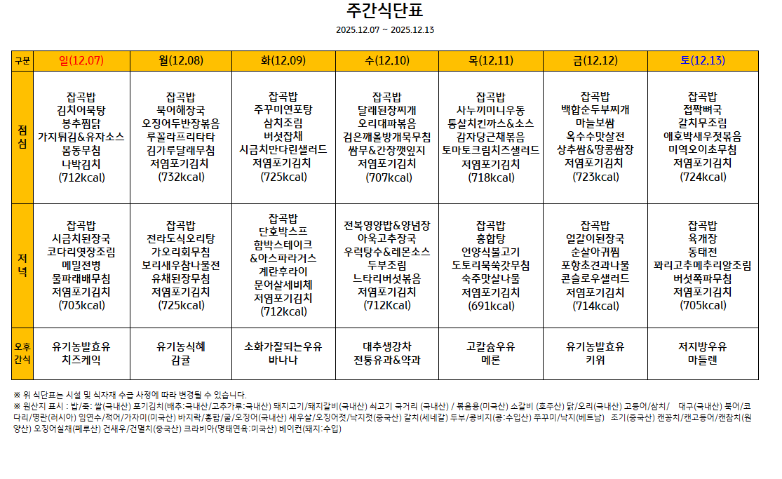 강동케어센터 [식단안내]강동케어센터 12월 2주차 주간식단표 페이지 정보 작성자 최고관리자 댓글 0건 조회 356회 작성일 25-12-05 17:35 목록 본문 목록 이전글[하루의 식단]12월 3일 수요일 25.12.05 다음글[식단안내]강동빌리지 12월 2주차 주간식단표 25.12.05