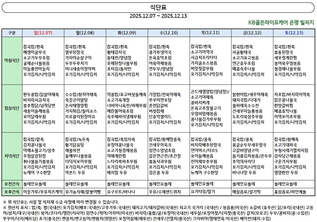 은평빌리지 [식단안내] 2025년 12월 2째주 식단표 페이지 정보 작성자 최고관리자 댓글 0건 조회 280회 작성일 25-12-05 21:45 목록 본문 목록 이전글[식단안내] 2025년 12월 2주차 주간식단표 25.12.06 다음글[오늘의 식단] 25년12월 1일 월요일 중식 25.12.05