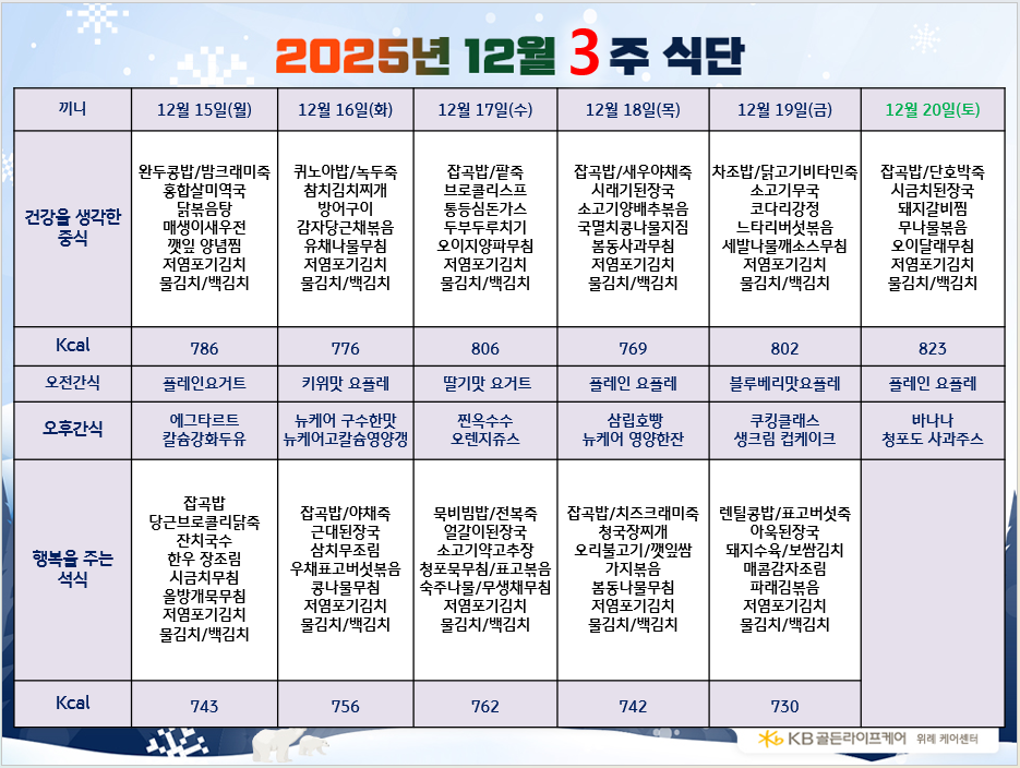 위례케어센터 [식단안내] 2025년 12월 3주차 식단표 페이지 정보 작성자 최고관리자 댓글 0건 조회 320회 작성일 25-12-12 08:56 목록 본문 목록 이전글[식단안내] 2025년 12월 3주차 식단표 25.12.12 다음글2025.12.10 Special Day 25.12.10