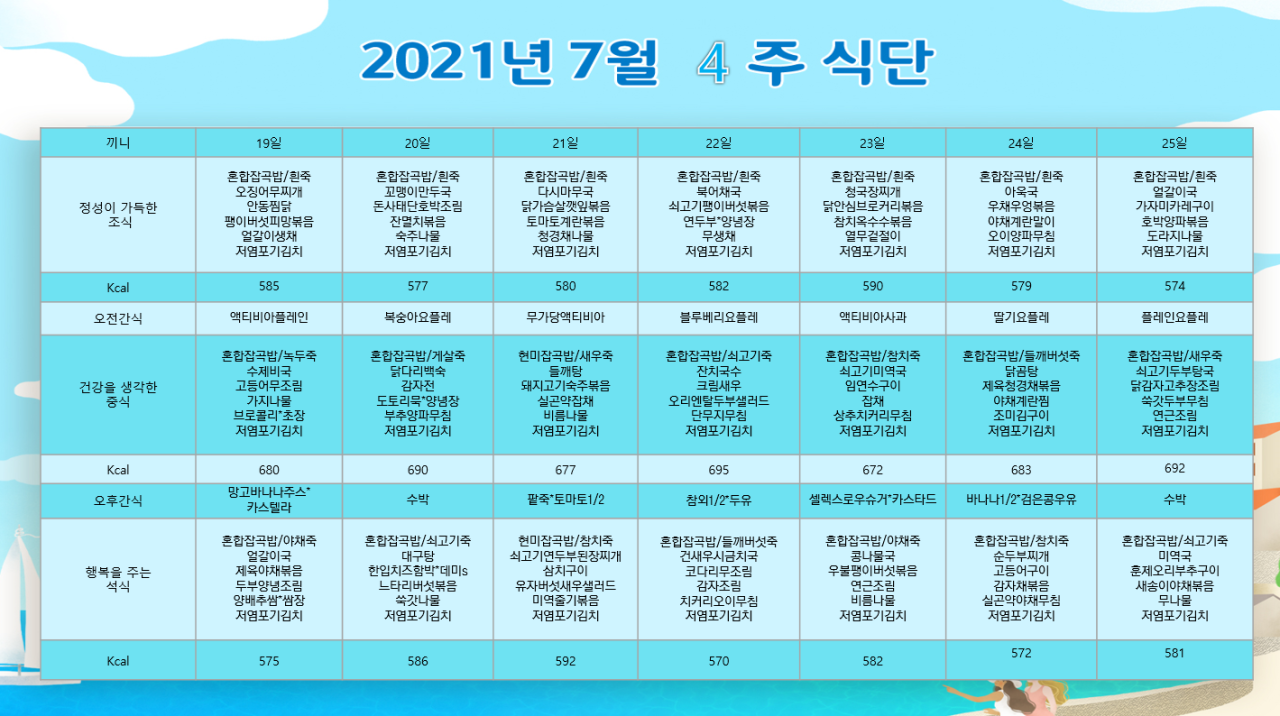 위례빌리지 [식단안내] 위례 빌리지 7월 4주차 식단표 페이지 정보 작성자 KB 골든라이프케어 댓글 0건 조회 3,031회 작성일 21-07-16 15:33 목록 본문 목록 이전글[식단안내] 위례 케어센터 7월 4주차 식단표 21.07.16 다음글[식단안내] 서초빌리지 7월 4주차 식단표 21.07.15