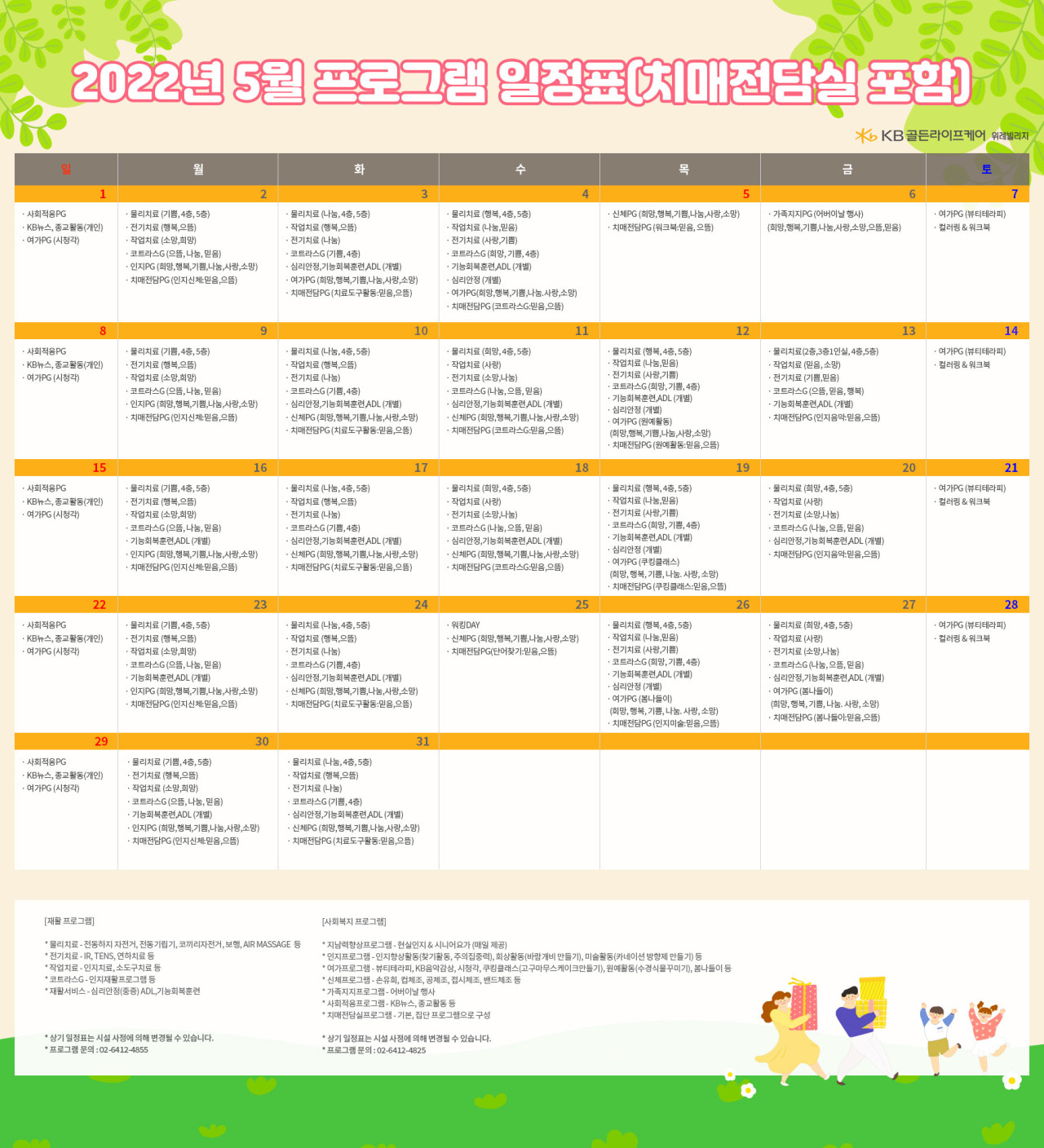 위례빌리지 [프로그램 안내] 2022년 위례 빌리지 5월 프로그램 일정표 페이지 정보 작성자 KB 골든라이프케어 댓글 0건 조회 3,102회 작성일 22-04-29 12:53 목록 본문 목록 이전글[식단안내] 서초 빌리지 5월 1주차 식단표 22.04.29 다음글[식단 안내] 2022년 강동케어센터 5월 식단표 22.04.28