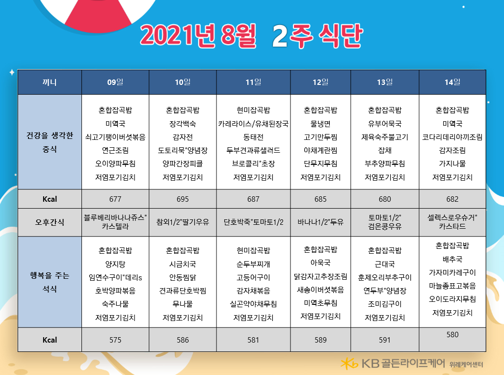 위례케어센터 [식단안내] 위례 케어센터 8월 2주차 식단표 페이지 정보 작성자 KB 골든라이프케어 댓글 0건 조회 2,712회 작성일 21-08-05 17:51 목록 본문 목록 이전글[식단안내] 서초빌리지 8월 2주차 식단표 21.08.09 다음글[식단안내] 위례 빌리지 8월 2주차 식단표 21.08.05