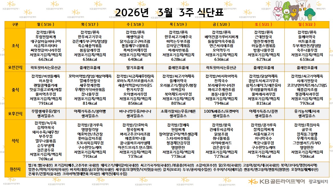 광교빌리지 [식단안내] 2026년 3월 3주 식단표 페이지 정보 작성자 최고관리자 댓글 0건 조회 113회 작성일 26-03-13 17:57 목록 본문 목록 이전글[식단안내] 2026년 3월 3주 식단표 26.03.13 다음글[하루의 식단] 2026년 3월 13일 26.03.13