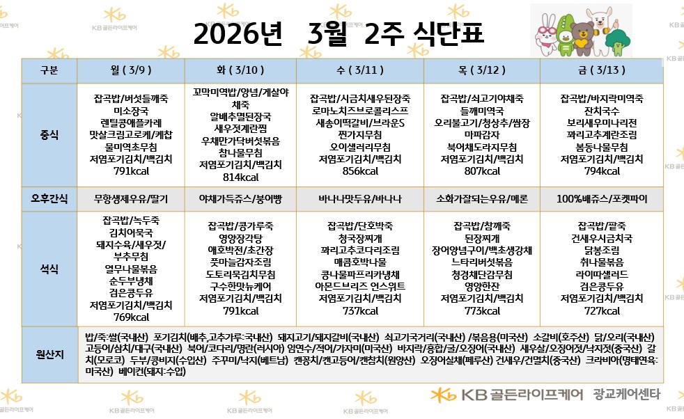 광교케어센터 [식단안내] 2026년 3월 3주 식단표 페이지 정보 작성자 최고관리자 댓글 0건 조회 107회 작성일 26-03-13 18:00 목록 본문 목록 이전글[식단안내] 2026년 3월 3주차 식단표 26.03.13 다음글[식단안내] 2026년 3월 3주 식단표 26.03.13