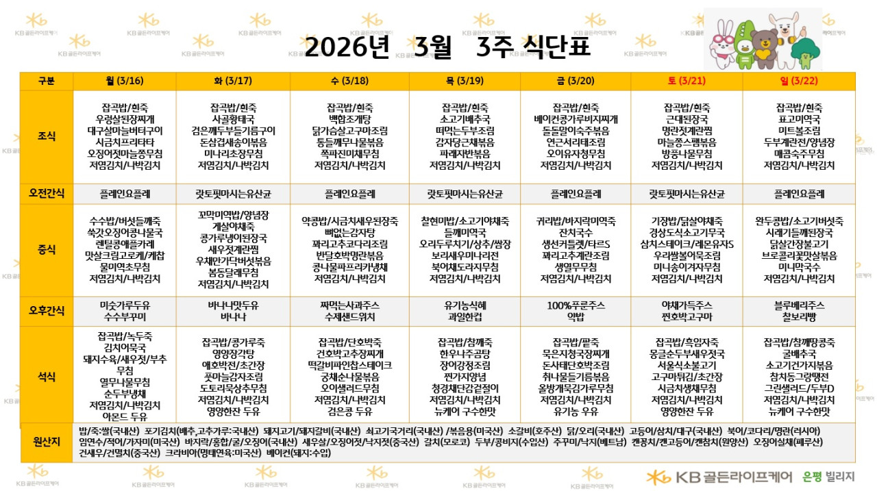 은평빌리지 [식단안내] 2026년 3월 3주차 식단표 페이지 정보 작성자 최고관리자 댓글 0건 조회 92회 작성일 26-03-14 09:41 목록 본문 목록 이전글[오늘의식단] 2026년 3월 10일 중식 26.03.14 다음글[하루의식단] 2026년 3월 13일 조/중/석식 26.03.14