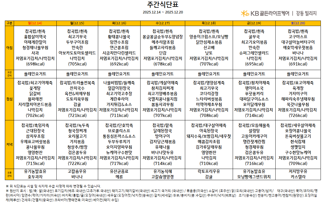 강동빌리지 [식단안내]강동빌리지 12월 3주차 주간식단표 페이지 정보 작성자 최고관리자 댓글 0건 조회 258회 작성일 25-12-12 15:39 목록 게시판 리스트 옵션 검색 본문 목록 이전글[하루의 식단]강동빌리지 12월 10일 수요일 25.12.12 다음글[하루의 식단]12월 3일 수요일 25.12.05